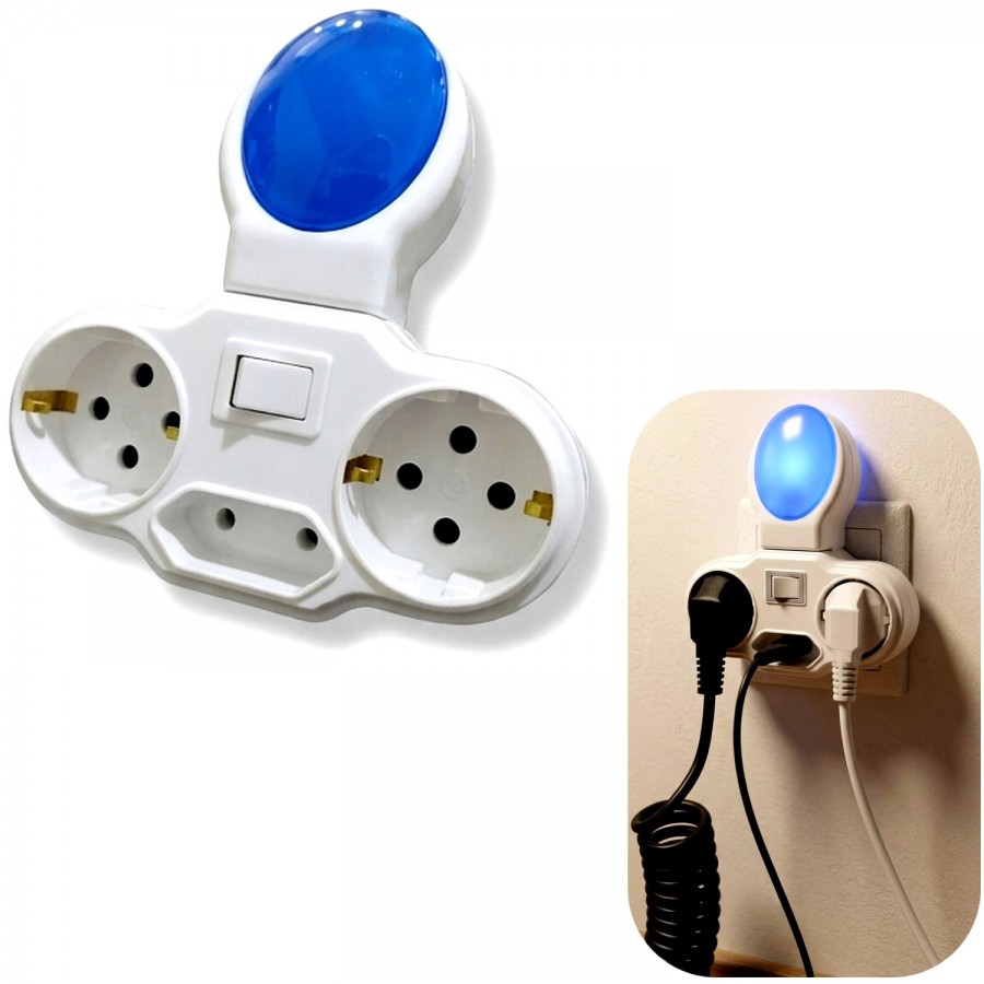 4’ü Bir Arada Gece Lambası 3’lü Golyat Priz | LED Işıklı, Anahtarlı, Mavi Işık, Çoklu Fiş Priz